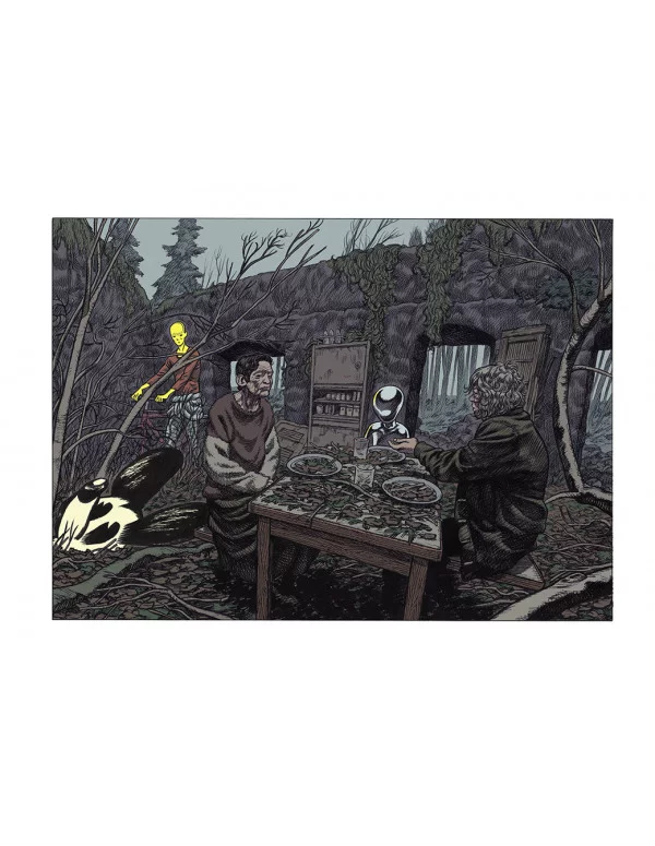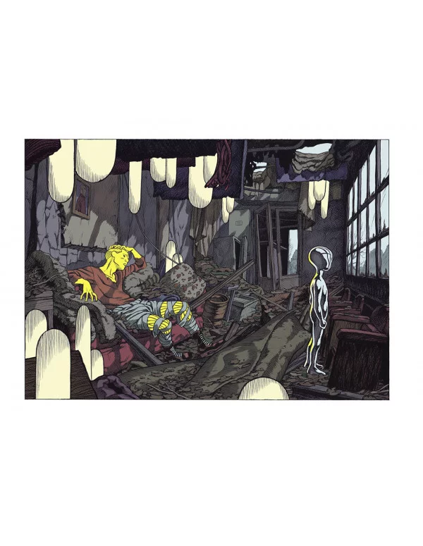 Guerras, desastres naturales, accidentes industriales, personajes y escenarios explosivos, naturaleza, cielo y océano desencadenados. El viaje que propone Frederik Peeters tiene lugar en entornos devastados, donde la prehistoria, el pasado, el presente y el futuro chocan, como si toda la cronología del mundo y de la humanidad se concentraran en un solo tiempo, un solo lugar, alrededor de este hombre preocupado, cuyo cuerpo y mente se están desmoronando. Una síntesis de la historia cuyo resultado no produce risa, sino desolación. La ganadería intensiva, la guerra, la contaminación, la comunicación virtual, el consumo excesivo... Frederik Peeters hace una amarga crítica del mundo saqueado por los hombres, en un álbum carente de palabras, pero cargado de significado.