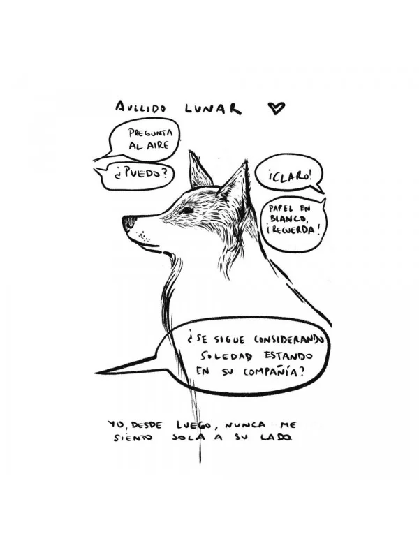 «Solo. Como ese hombre que carga con una bolsa de pañales para adultos». Dice su autora que la imagen de ese hombre fue el comienzo de todo, el detonante de un ir y venir de pensamientos. La que le llevó a dialogar sin guion previo, de manera espontánea, solitaria y sin juicios, para analizar y cuestionar diferentes matices acerca de la soledad, y sobre otros temas que van apareciendo por el camino. El libro, dibujado en blanco y negro, es un largo soliloquio reflexivo sobre la soledad: la buscada (a veces estar solo es estar bien), o la impuesta (puede ser sinónimo de tristeza). Sus reflexiones se apoyan en dibujos de tinte expresionista, porque la autora confiesa que la verdadera libertad la encuentra en el papel sobre el que dibuja sus pensamientos: «todo ha sido cuestión de tiempo, de muchos intentos, muchos juicios previos, muchas trabas, mucha búsqueda de la belleza, de lo estético, de los socialmente correcto. Hasta llegar a entender que el papel en blanco es mucho más que todo eso, es el espacio donde todo puede suceder, donde tiene cabida lo real y lo ficticio. El papel es un acompañante que no te juzga, ni te impone sus normas, el papel te deja ser». Y como final, un razonamiento que explica todo el libro: «Me gusta la soledad porque sé que no estoy sola»