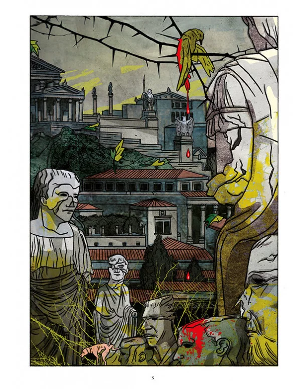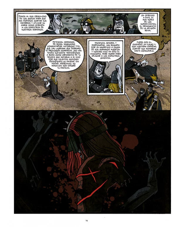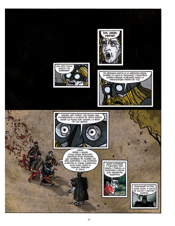 El Tito Andrónico de Prior y Rico es una adaptación –“traición” apuntan sus autores, en su respetuosa y documentada traslación al cómic– de la tragedia homónima, generalmente fechada entre 1592 y 1594, años en los cuales se prohibieron las representaciones teatrales en Londres cuando las muertes semanales a causa de la peste superaban la cifra de 30. “Conjuras, presagios, fatalidad, los desastres de la guerra... Si la tragedia se define en su naturaleza inexorable –asegura el escritor y crítico, Rubén Lardín–, esta adaptación del clásico lo hace en su oportuna vibración entre la mascarada black metal y el retablo ultragore. Un tebeo salteado de arrebatos extáticos que en su apreciación política nos remite a la realidad siempre inmoderada, al contubernio que rige nuestra organización social aquí y ahora, y que no olvida señalarnos como responsables de nuestra propia calamidad”.