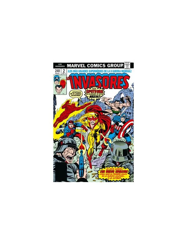 Segundo de los cinco tomos que recopila la época clásica de Los Invasores. Los tres grandes héroes de la Edad de Oro, El Capitán América, La Antorcha Humana Original y Namor, se unen en el mayor supergrupo de la Segunda Guerra Mundial. Ellos son... Los Invasores! Suponen la primera alianza con la que Estados Unidos entró en la contienda contra los nazis, en un proyecto retrospectivo soñado y cumplido en los años setenta por Roy Thomas, junto al dibujante de culto Frank Robbins. Este tomo presenta el debut de la Bala Azul, la incorporación de Spitfire, el primer Annual de la serie o el regreso de Unión Jack.