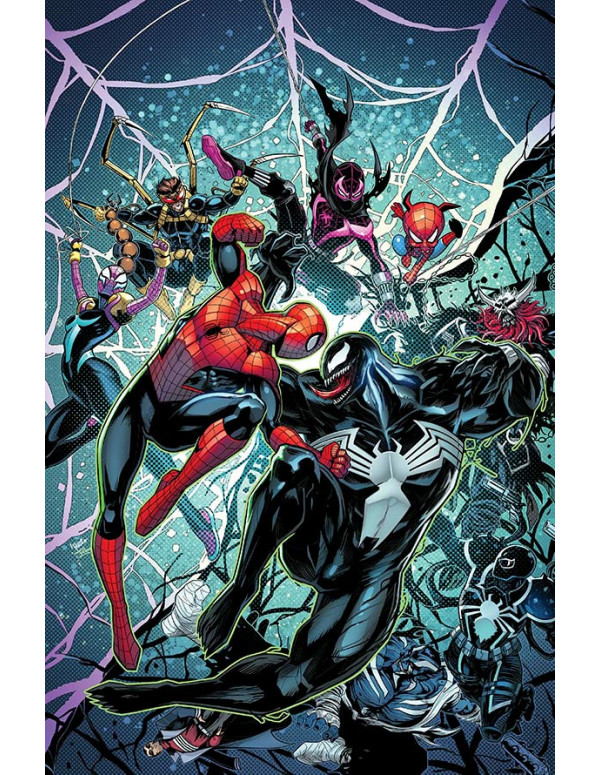¡Tenía que ocurrir! ¡Arañas contra simbiontes, a lo largo del Multiverso! La guerra ha estallado y el destino del Spiderverso y el Venenoverso está en la balanza. ¿Lograrán Spiderman y los suyos proteger el Corazón Araña o se impondrán Veneno y la mente colmena? ¡Historia completa en un único volumen!?