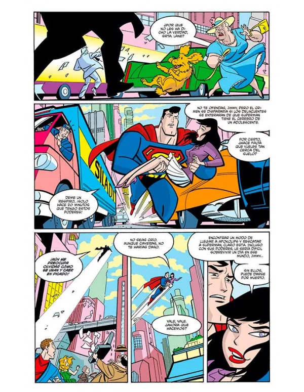 ¡Superman contra Kalibak y Darkseid en Apokolips! Una pelea espectacular, ¡pero algo diferente! ¿Cómo es posible? Superman ha cambiado de cuerpo por… ¡¿Jimmy Olsen?!