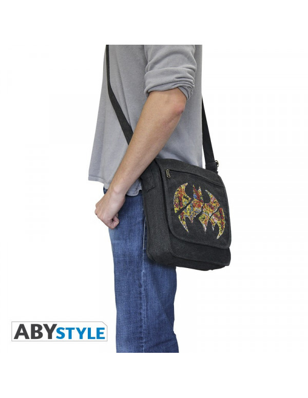 Bolsa bandolera con la imagen del símbolo de Batman con logos en su interior