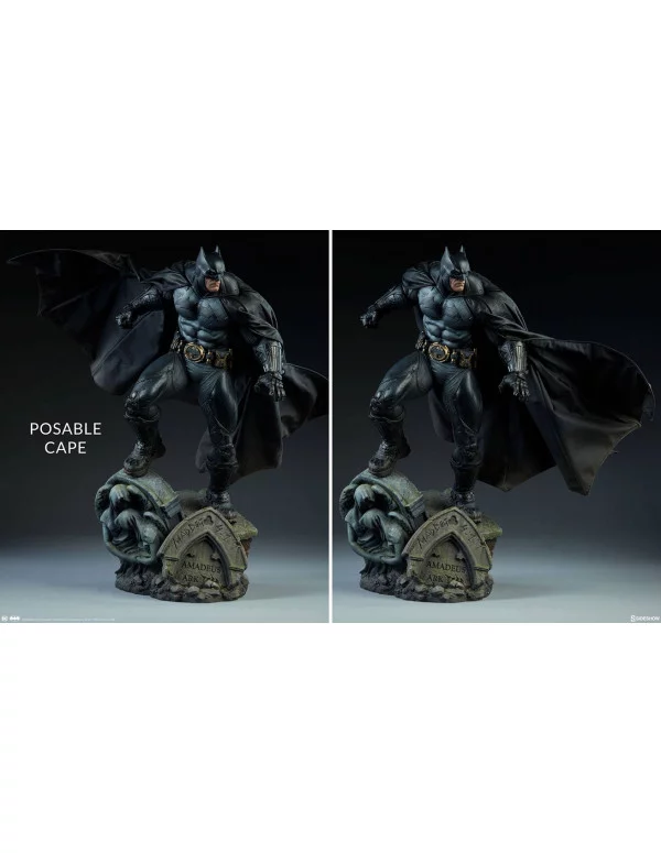 Sideshow se enorgullece en presentar la figura Batman Premium Format. Batman alcanza los 53 cm de alto encaramado sobre una base del cementerio de Arkham, que presenta la historia del famoso asilo de Gotham escondido en su interior.La figura de poliresina porta un mono táctico esculpido en negro y gris con un cinturón de herramientas dorado. El pecho, los guanteletes y las botas de Batman están texturizados con daños de combate. El rostro de Batman está detallado con una expresión sombría, enmarcado por su famosa capucha con ojos blancos. También tiene una capa de tela a medida con cableado interno para permitir poses de capa personalizadas al exponer la pieza.¡Ilumina la Bat-señal y aade la figura Premium Format a tu colección de DC hoy!
