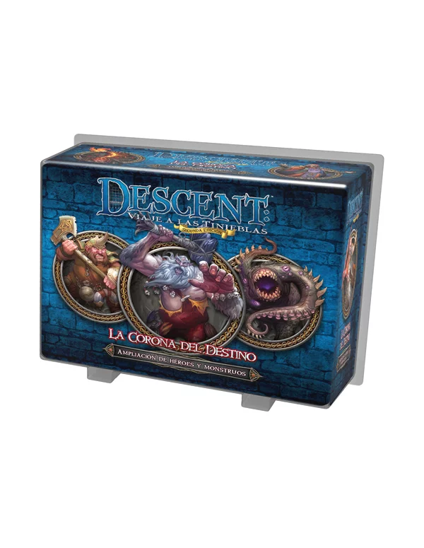 Mughin ha bajado de su cubil. Si puedes arrinconar al viejo gigante en la mina de gemas, quizá desvele su mayor secreto: la ubicación de la Corona del Destino. Este artefacto, que aparece solamente en los mitos más antiguos y extraños, podría permitir controlar el destino. ¡Es hora de reforjar el pasado y eliminar la incertidumbre del futuro! Incorpora héroes legendarios y monstruos infames a tus partidas de Descent: Viaje a las tinieblas con el nuevo surtido de héroes y monstruos de La Corona del Destino. Explora los puntos fuertes y las debilidades de estos monstruos y héroes jugando a las aventuras exclusivas de esta expansión por separado o utilizando cartas de Rumor. ¡Con 4 héroes, 3 grupos de monstruos y 2 aventuras nuevas, La Corona del Destino te brinda nuevas opciones para tus partidas de Descent: Viaje a las tinieblas!
