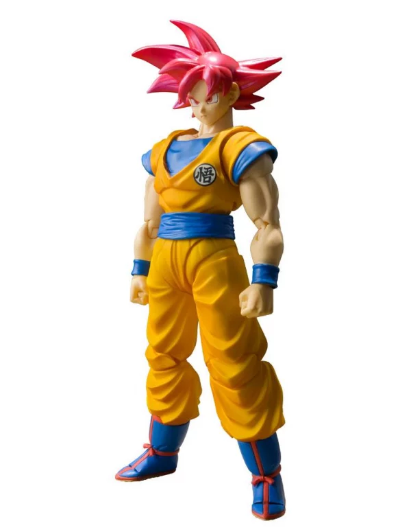 Tamashii Nations presenta esta exclusiva de su web dentro de su línea de figuras S.H. Figuarts la figura de Son Goku Super Saiyan God basado en la nueva serie Dragon Ball Super. Esta figura tendrá como complemento al dragón Shenron (se vende aparte). Esta figura articulada mide 14 cm y está hecha en PVC. Incluye 3x expresiones faciales y 4x manos intercambiables. Compatible con el efecto Aura de Energía Tamashii Effect (también se vende por separado).