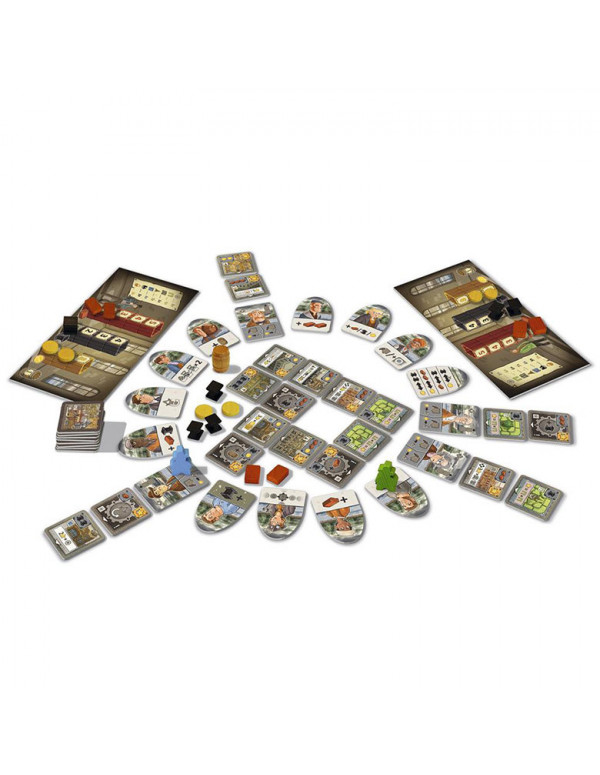 Contenido: 2 tableros de Jugador, 2 peones de Mercader, 25 fichas de Recurso, 37 piezas de Edificio, 4 piezas de Arquitecto, 14 piezas de Contrato y 1 reglamento.