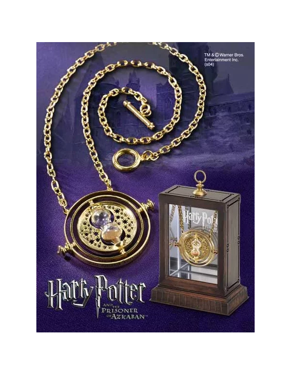 Una auténtica recreación del Giratiempos de Hermione en la película Harry Potter y el Prisionero de Azkaban. El Time-Turner viene con un reloj de arena en miniatura y sus anillos internos giran. Chapado en oro de 24 kilates. Mide 1 3/8 pulgadas de diámetro. La cadena mide 18 pulgadas. Viene con una pequeña vitrina (la de la imagen).