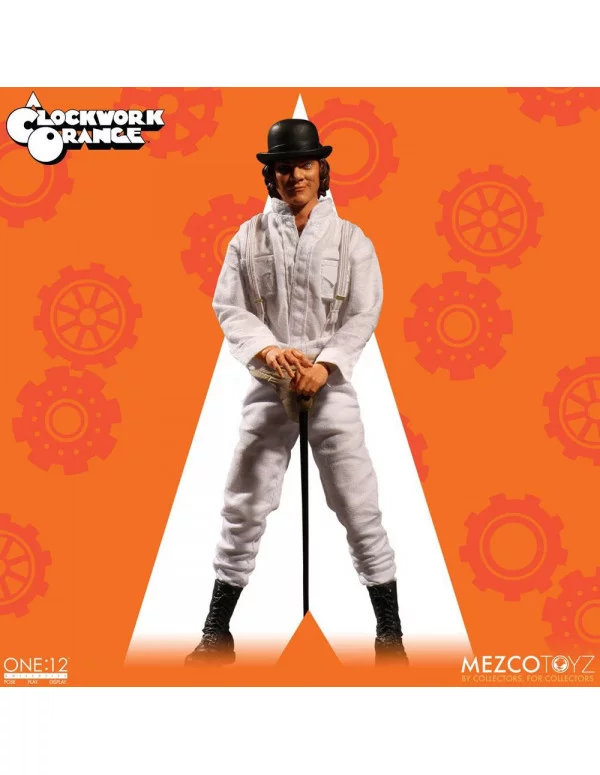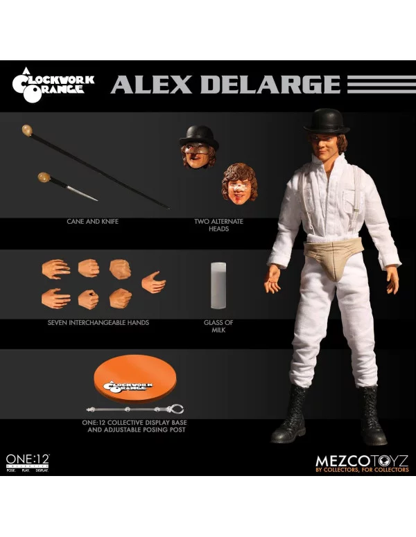 Mezco nos trae la nueva figura de Alex DeLarge, personaje de "La Naranja Mecánica", para la colección One: 12 Collective. La figura mide aproximadamente 17 cm y viene con más de 28 puntos de articulación, completamente detallada y con la imagen del aclamado actor, Malcolm McDowell. Incluye tres expresiones distintas, 7 manos intercambiables, sombrero, máscara, tirantes elásticos, botas, bastón, cuchillo, vaso de leche y una base soporte para exposición.
