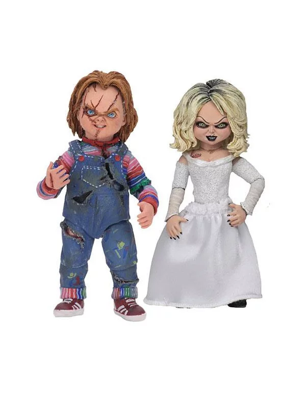 NECA presenta la versión Ultimate de las figuras de Chucky y Tiffany, basadas en la película "La Novia de Chucky" y anunciada en la San Diego Comic Con 2018. Este pack es una versión articulada con más de 20 puntos de articulación, hecha en PVC y con un tamaño de unos 10 cm. Incluye además 6 cabezas intercambiables, falda de tela, brazos extra de Tiffany para poder usar su icónica chaqueta de cuero, 2 palas, 2 pistolas, 2 cuchillos, un hacha, una botella, un baster y un collar.