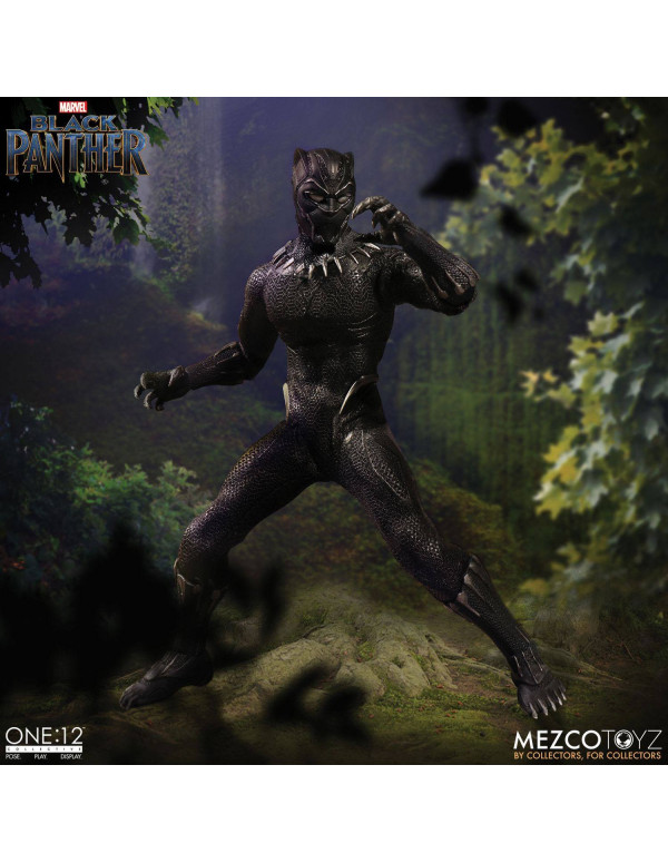 Mezco, dentro de su colección de figuras The One:12 Collective presenta la figura de Black Panther, basada en su nueva película estrenada recientemente. La figura está diseñada con un traje de tela que recrea el traje del rey T'Challa's Vibranium, accesorios auténticamente detallados y la imagen del actor Chadwick Boseman. La figura mide unos 17 cm de alto y cuenta con más de 30 puntos de articulación, viene con dos rostros intercambiables, uno enmascarado y otro sin máscara y 8 manos intercambiables. Además viene equipado con un escudo y una lanza meticulosamente elaborados, que replican las armas que se ven en la película.