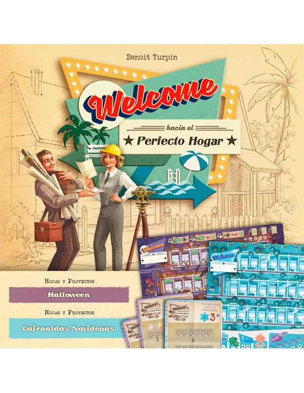 En Welcome los jugadores son arquitectos americanos en la década de los 50, durante pleno "Baby Boom" compitiendo para ver quién de ellos será el que ejecute mejor los proyectos de la Ciudad creando las parcelas más bonitas en las tres calles que se le han asignado, con sus lujosos parques y piscinas. Con este bloc de 100 hojas de expansión (50+50) podrás experimentar nuevas opciones de juego del popular Welcome y así darle más variabilidad aun al juego.