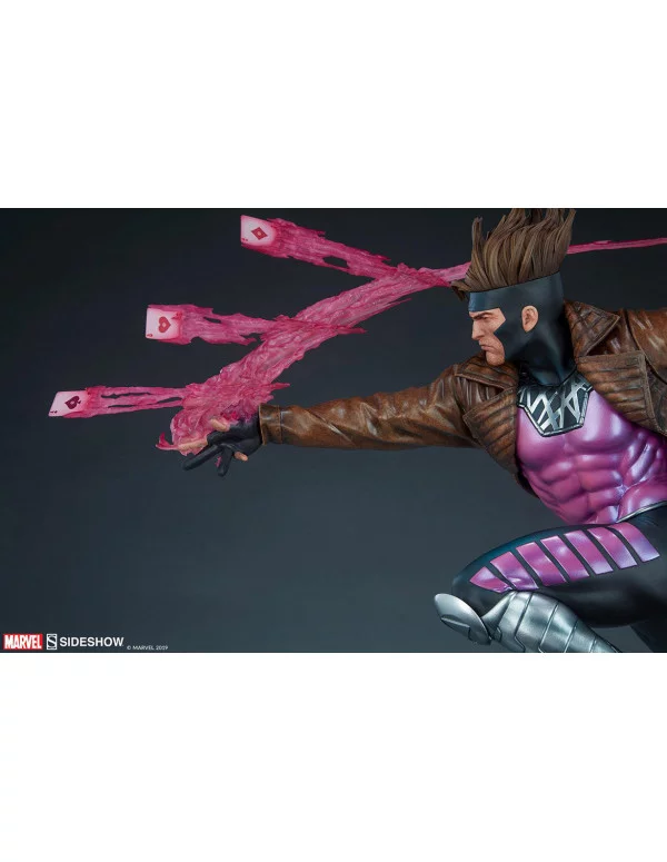 La Maquette de Gambirt se abre paso en la colección X-Men.La estatua muestra cómo el furioso Cajun se lanza a la batalla sobre una garra mecánica gigante que emerge de la base de la Sala de Peligro. Ráfagas de energía cinética púrpura explotan del arma cuando Remy LeBeau salta en ayuda de sus compañeros X-Men, asiendo su bastón bo y arrojando varias cartas cargadas a la refriega.