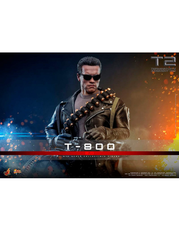 Esta figura de acción coleccionable de gran precisión presenta una cabeza esculpida de nuevo diseño con ojos móviles independientes y dos estilos de cuero cabelludo. El cuero cabelludo desmontable permite a los coleccionistas extraer la CPU del T-800 del dispositivo de almacenamiento de la cabeza. El atuendo, confeccionado con gran maestría, destaca por su chaqueta y pantalones de cuero auténtico, además de un brazo izquierdo que deja ver el endoesqueleto. Incluye armas como una ametralladora, una escopeta, una pistola, un lanzagranadas, munición y un cinturón portamuniciones, así como accesorios como unas gafas de sol, una bolsa de lona, ??una caja de regalo con rosas y una base temática para la figura.