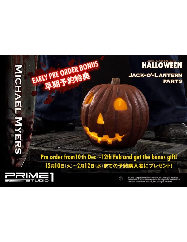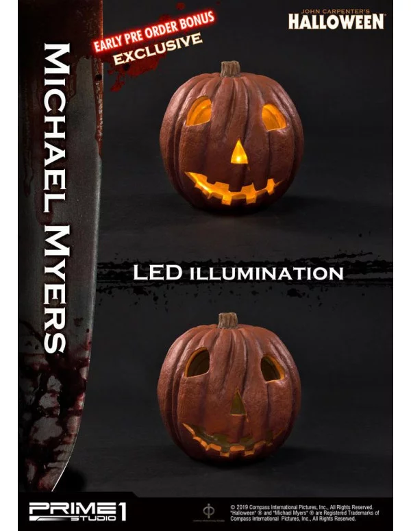 Estatua de poliresina a escala 1/2 de la película "Halloween", dimensiones aprox. 105 x 48 x 45 cm. Modelo finalizado y pintado a mano. Licencia oficial. Edición limitada.La Versión Bonus viene con una función de luz. Aviso importante: Debido a las medidas del artículo, costes adicionales de envío deben ser aplicados. Hasta que no llegue el artículo a nuestros almacenes, se desconocen las medidas y el peso del paquete. Una vez recibido, y conociendo su dirección de envío final, se calcularán los costes de envío.