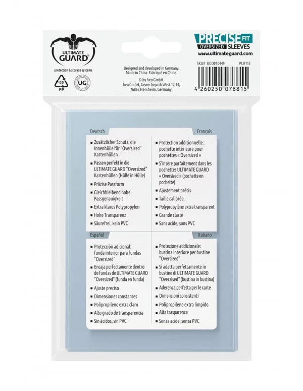 Estas fundas se adaptan perfectamente a las oversized de ULTIMATE GUARD (funda en funda). Perfectas para Magic the Gathering(TM) Commander y otras cartas oversized. 40 fundas por paquete.- Protección adicional: funda interior para cartas- Ajuste preciso- Dimensiones constantes- Polipropileno extra claro- Alto grado de transparencia- Sin ácidos, sin PVC- Tamaño de fundas: 89 x 127 mm