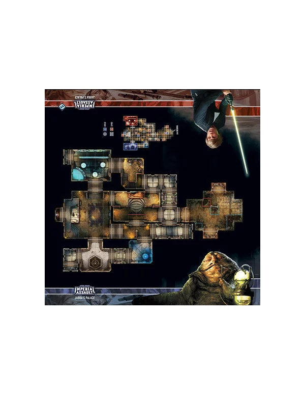 Con el Tablero de Escaramuza del palacio de Jabba podrás disfrutar al máximo de los torneos de Imperial Assault. Sus 66 x 66 cm muestran la guarida de Jabba, con sus retorcidos pasillos, las sala del trono y el pozo del rancor, impresos directamente en el tapete para que tu preparación de la partida no dure más de unos segundos. tendrás sitio de sobra para tus cartas y fichas junto a las estupendas ilustraciones de Luke y Jabba.