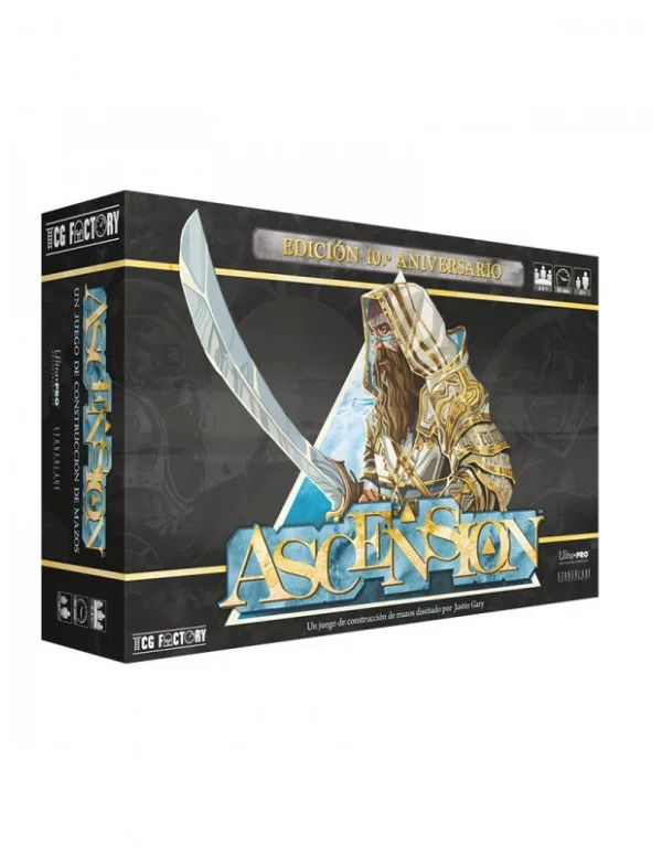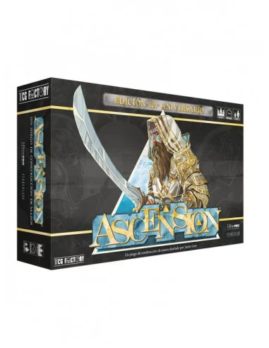 Bienvenido a Ascension, uno de los juegos de cartas más aclamados por la afición que por fin, después de más de una década desde su publicación, llega a las tiendas con una versión en español. Ascension Edición 10.º Aniversario recoge la esencia, mecánicas y cartas de la primera caja publicada en inglés, en el año 2010, pero con suficientes cambios como para convertirla en un producto adaptado a las necesidades contemporáneas. Esta nueva edición décimo aniversario es el punto de partida perfecto para iniciarse en Ascension. Cada nueva colección que llegue al mercado es un juego independiente con mecánicas únicas que añaden nuevas experiencias al título clásico. Esta versión 10.º Aniversario presenta nuevas ilustraciones, un reglamento revisado y un tablero especialmente diseñado para celebrar los diez años de vida del juego. La línea Ascension fue creada por tres jugadores de alto nivel de Magic the Gathering, el famoso juego de cartas ideado por el matemático Richard Garfield en la década de los 90. Con este nuevo juego, John Fiorillo, Justin Gary y Brian M. Kibler dieron rienda suelta a la inquietud lúdica que tenían como jugadores profesionales de Magic: querían un juego de cartas que transmitiera la épica del título de Garfield, pero eliminando la vertiente coleccionable. Desde entonces, Ascension ha dado a luz a más de una decena de expansiones y ha reunido a una importante comunidad compuesta por millones de jugadores. Ascension es un juego de cartas para 2 a 4 jugadores (con variante en solitario) con partidas rápidas que se disputan en apenas 30 minutos. Es lo que en el sector especializado de los juegos de mesa modernos se denomina juego de construcción de mazos (deck building game, en inglés). Componentes: 100 cartas del mazo central con borde negro 41 cartas «siempre disponibles» con borde plateado (20 de Místico, 20 de Infantería Pesada y 1 de Sectario) 40 cartas «iniciales» con borde blanco (4 mazos iniciales con 8 cartas de Aprendiz y 2 de Milicia cada uno) 50 contadores de honor (25 rojos grandes y 25 blancos pequeños) 1 tablero de juego Y, ahora, por fin, tiene edición en español.