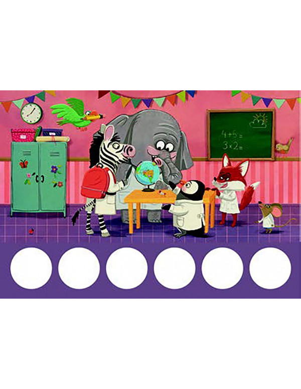 Todo sucede en esta escuela. No sólo hay clases y experimentos, también podrás ver un montón de aviones de papel y juegos infantiles. ¿Pero dónde está la mochila del zorro?
