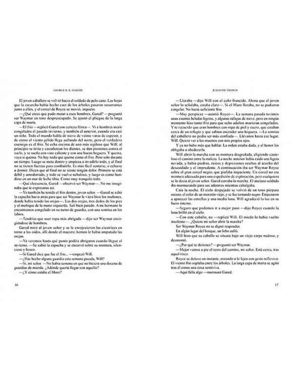 Una maravillosa edición de lujo en tapa dura, con acabados dorados y llena de ilustraciones en blanco y negro y a todo color, de uno de los mayores fenómenos literarios de los últimos tiempos. «Cuando se juega al juego de tronos, solo se puede ganar o morir. No hay puntos intermedios». En un mundo diferente al nuestro, en el que los veranos y los inviernos duran generaciones, un gran conflicto está a punto de estallar. Robert Baratheon ocupa el Trono de Hierro en el cálido y opulento sur de Poniente. Se lo arrebató tras una sangrienta guerra al último rey loco de la dinastía Targaryen, señores de dragones. Sin embargo, ahora su poder se ve amenazado: en el norte, el Muro erigido para proteger el reino de las bestias y de los extraños se tambalea. Hace siglos que nadie ve a los caminantes blancos, pero ¿quiénes son entonces esos seres de ojos azules y fríos que se ocultan en las sombras de los bosques y que les arrebatan la vida y la mente a aquellos desafortunados que se cruzan en su camino? El final del verano está próximo, se acerca el invierno y solo un milagro podrá disipar las tinieblas.La crítica ha dicho: