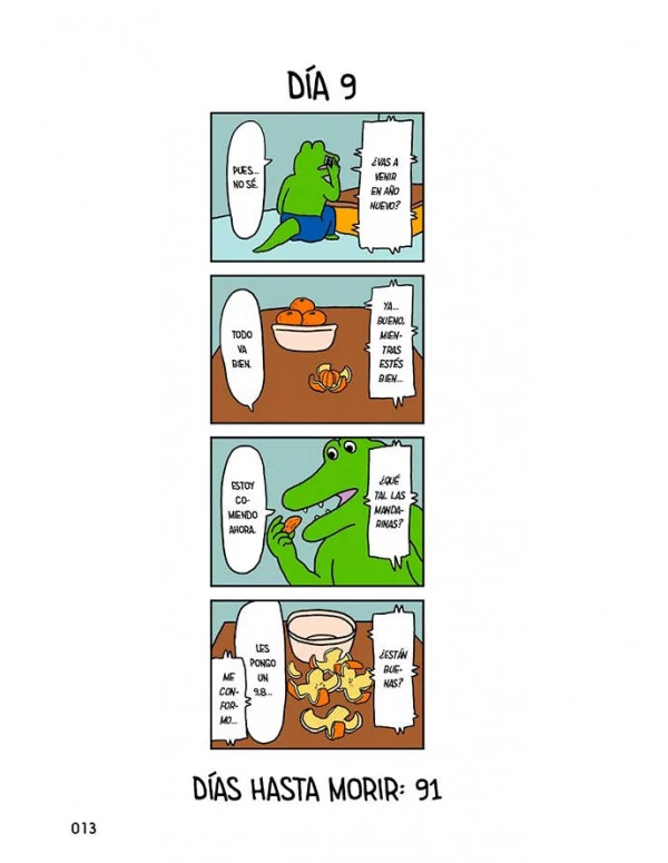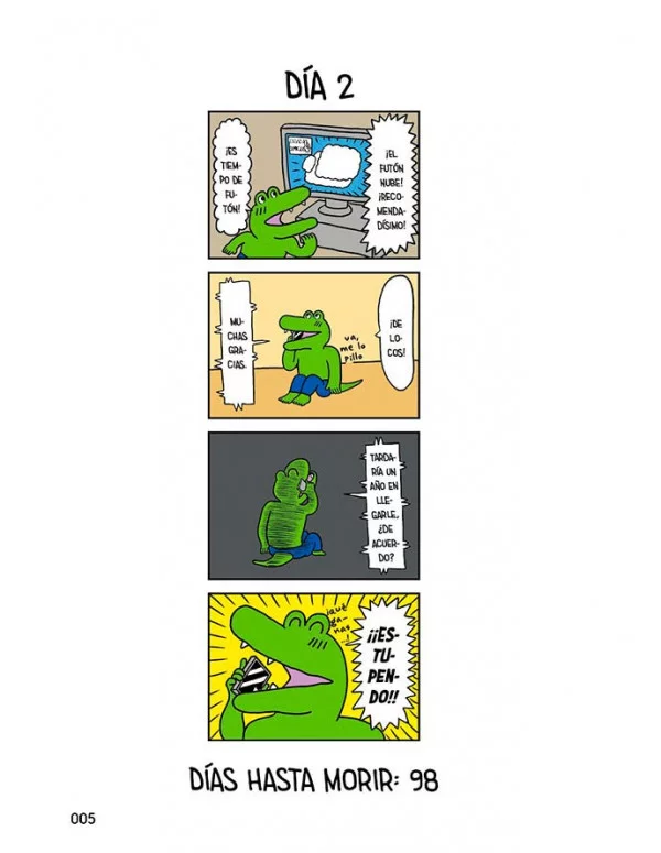 Crónica de una muerte anunciada, supongo Aquí no hay ni trampa ni cartón: el protagonista de este cómic, un cocodrilo que se llama cocodrilo, va a morir. Es inevitable. Su destino está escrito, pero eso no le va a impedir disfrutar de unos buenos fideos, pegarse una vuelta con los colegas o meterse en torneos de videojuegos. También buscar el amor, que la vida son dos días. O cien en este caso. Este es el primer día del resto de la vida de Cocodrilo.